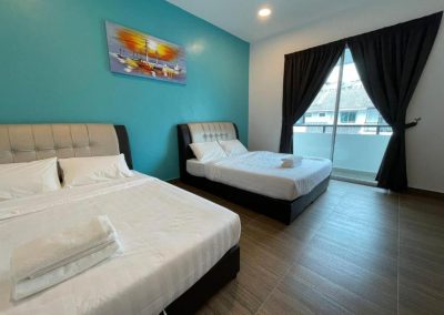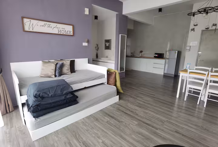 • Bed layout: Typically 1 queen bed + 2 futon beds (or similar) in a studio format.